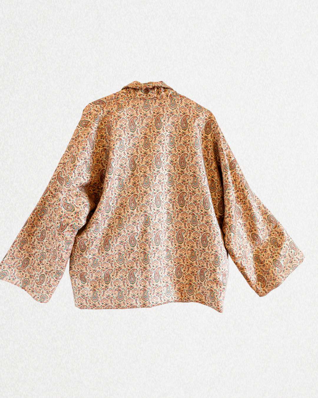 open-front jacket with a softly draped collar; a warm beige base featuring intricate paisley motifs; and a structured jacquard that provides subtle volume and sheen.